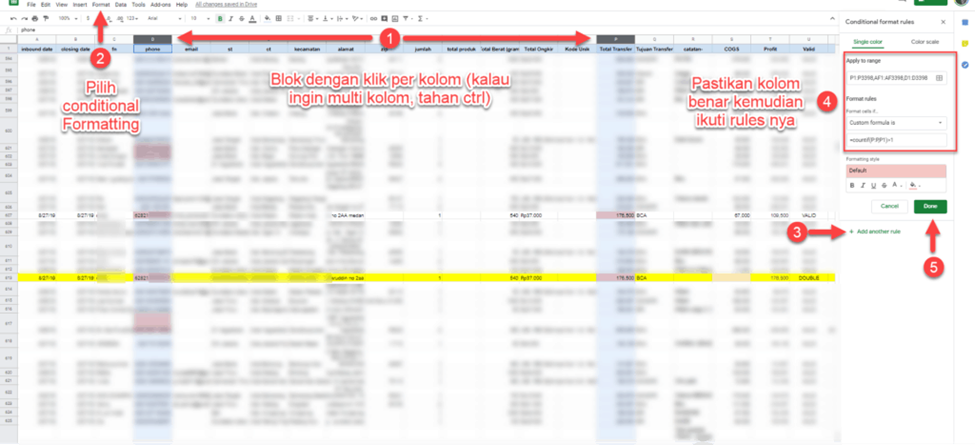 Dengan mengaplikasikan rule di bawah, cell yang memiliki value yang sama akan otomatis berwarna merah. Sehingga, shipper jadi sadar kalau ada masalah dengan konsumen tersebut sehingga perlu investigasi lebih lanjut. Jika memang double, akan di ignore dan highlight kuning dengan komentar double di kolom valid.